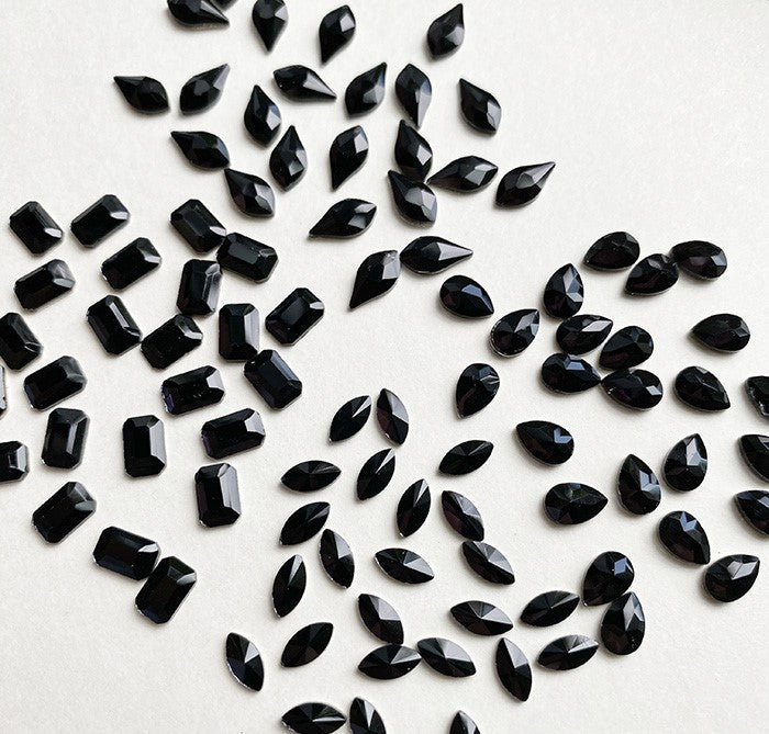 Taille: Rectangle 4x6mm; œil de chat 6×4 mm; feuille 8x4mm; goutte 6×4 mm; Virgule droite et gauche 4×9 mm; petit ovale 3×5 mm; forme diamant 4x6mm.